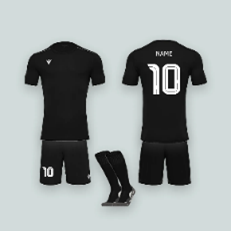Zwart sportief tenue, mogelijk om je naam, team, nummer en club erop te verwerken.